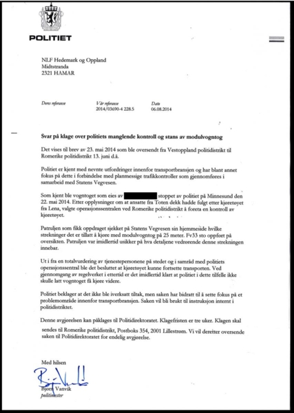 Intern opplæring I et brev fra politimester Bjørn Vanvik i Romerike politidistrikt til NLFs regionsjef får han et svar som er oppmuntrende. I ettertid innser politimesteren at de ikke skulle ha latt sjåføren av modulvogntoget kjøre videre. Han beklager politiets håndtering og lover at denne episoden nå blir «pensum» i politiets interne opplæring.