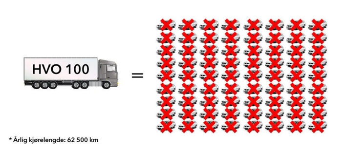 Hvis lastebilene hadde kjørt på fossil diesel, ville de ha sluppet ut like mye CO2 som 16 personbiler hver (se utregning av personbiltallene nederst i artikkelen).