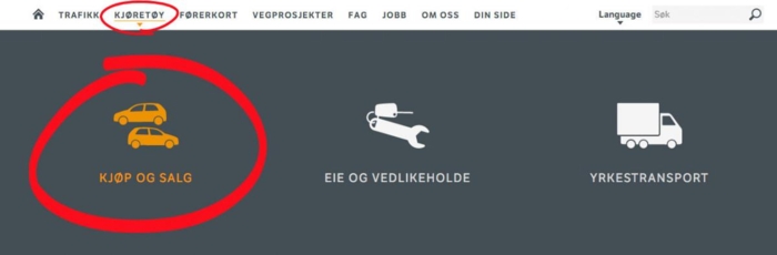 1. Gå inn på Statens vegvesens nettsider, www.vegvesen.no. Velg fanen "kjøretøy" og deretter underkategorien "kjøp og salg". (Alternativt kan adressen www.vegvesen.no/bilinfo brukes for å komme rett inn til riktig side.)