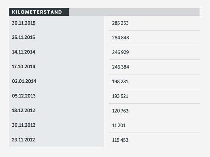 5. Informasjon om kilometerstand finner du helt nederst på informasjonssiden. Merk at avvik i kilometerstandhistorikken ikke nødvendigvis er juks eller svindel. Det kan også skyldes feiltasting, rettelser fra miles til kilometer, at bilen har byttet speedometer eller at telleren har nullstilt seg ved 100.000 km. I vårt eksempel kunne vi for eksempel se at det er tastet feil ved en kontroll i november 2012 (sannsynligvis en etterkontroll siden den var inne til sjekk uken før). Kilometerstanden ellers ser ut til å stemme - her er det nok ikke svindel på gang.