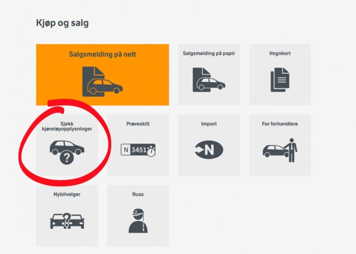 2. På "kjøp og salg"-siden velger du menyen "sjekk kjøretøyopplysninger", eller bruk denne direktekoblingen.
