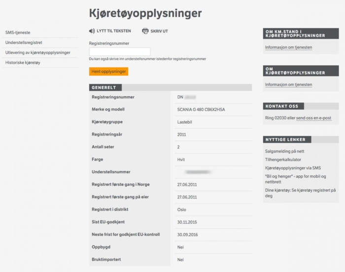 4. Alle tilgjengelige data på kjøretøyet skal dukke opp, hvis registreringsnummeret er tastet korrekt. Vi har brukt en 2011-modell Scania G480 6x2 som eksempel.