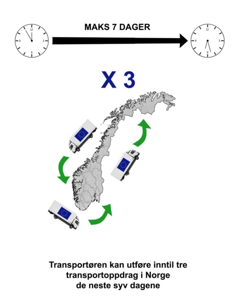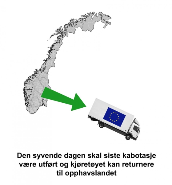 En lastebil som kommer til Norge fra et annet EØS-land og leverer fra seg lasten, kan ta på seg inntil tre kjøreoppdrag innenlands i Norge i løpet av de 7 neste dagene. Hvis det foretas flere enn tre turer, eller hvis de tre turene ikke er ferdigkjørt i løpet av 7 dager, er kabotasjen å anse som ulovlig og kan straffes.
