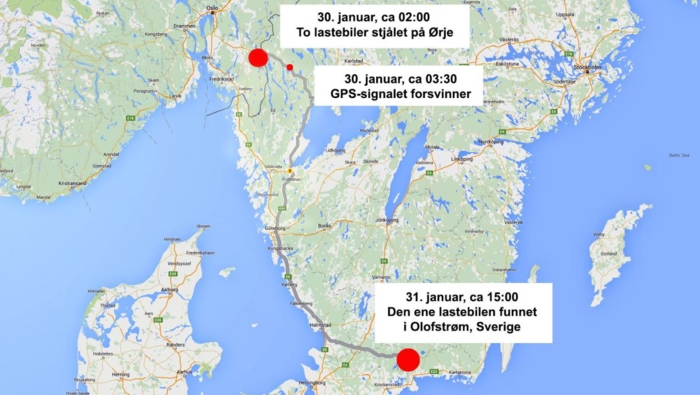 Lastebilene tilhører det svenskeide firmaet Uno Jonssons Åkeri AB, men ble stjålet fra bedriftens vaskehall på norsk side av grensen rundt klokken 02:00 natt til lørdag. GPS-sporet indikerte at bilene ble flyttet over til Sverige før signalet forsvant rundt 03:30 på natten.