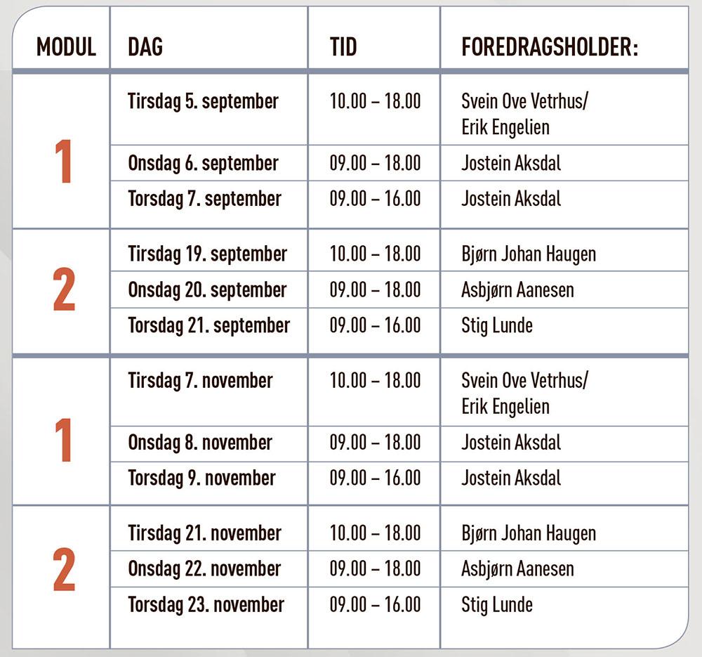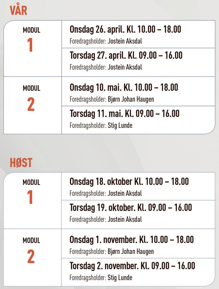 Kurs i trafikkledelse består av to helgesamlinger / moduler, to dager per modul. Begge går fra kl. 10:00-18:00 på onsdag, og fra kl. 09:00-16:00 på torsdag. Finn datoene som passer for deg i kalenderen under: