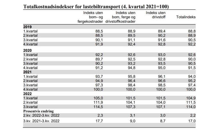 Totalkostnadsindeksen for lastebiltransport uten bom- og fergekostnader steg med 2,3 prosent fra 2. kvartal til 3. kvartal 2022. Fra 3. kvartal 2021 til 3. kvartal 2022 har de totale kostnadene uten bom- og fergekostnader steget med 17,7 prosent.