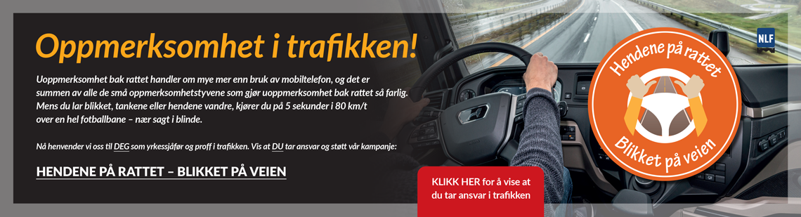 Du som er profesjonell sjåfør: Ta et personlig standpunkt og vær et eksempel for andre ved å vise at du støtter NLFs kampanje for å stoppe rattsurfing. Vi skal ikke bare være de største, lengste og tyngste langs vegene. Vi må også vise at vi er de beste. De beste i vårt yrke. De beste til å følge lover og regler. De beste til å ta ansvar på vegen.
