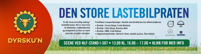 NLF inviterer til «Den store lastebilpraten» under Dyrsku`n fredag 13. september klokken 16:00. Møt opp på NLF standen eller følg sendingen på lastebil.no og bli en del av diskusjonen om fremtidens transportløsninger.