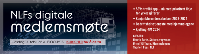 Onsdag 14. februar blir det nytt digitalt medlemsmøte fra NLF-studio i St. Olavsgate i Oslo. Blant annet vil SSVs trafikkapp med ny prioritert linje for yrkessjåfører demonstreres, og resultatene fra konjunkturundersøkelsen fra 2023 vil presenteres.