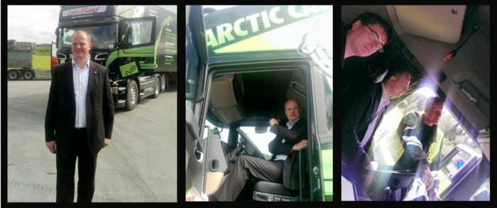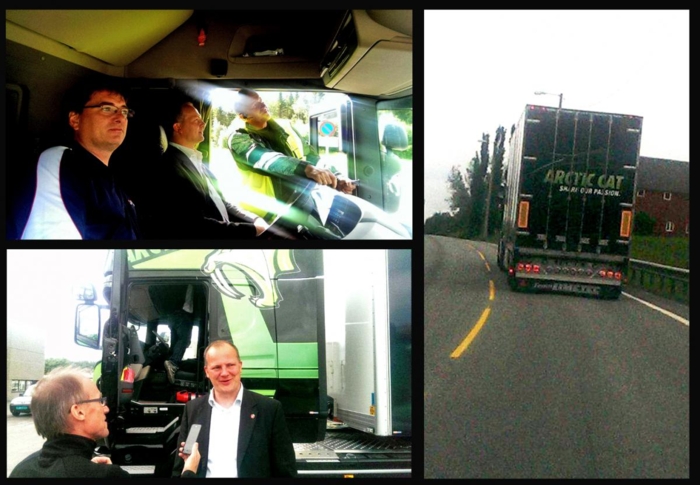 Det er daglig leder Arild Sand som er sjåførlærer på turen. Bilen har han valgt med omhu. Vogntoget er lakkert med reklame for Artic Cat, noe som bør passe samferdselsministeren helt ypperlig. Lasten er på vei nordover, til bruk i regjeringens prøveordning for fri ferdsel i utmark - med snøscooter.