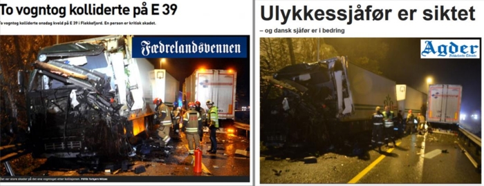 De har nå siktet en polsk mann for uaktsom kjøring. Den danske mannen i det møtende vogntoget fikk svært alvorlige skader, men skal ifølge lensmannen nå være utenfor livsfare og på bedringens vei. Polakken kom fra ulykken uten skader.