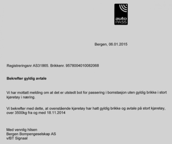 MYNDIGHETSSVINDEL: Den 5. januar 2015 blir Utne Transport ilagt bot av Statens vegvesen på 8 000 kroner for ikke å ha hatt gyldig bompengeavtale. Den 6. januar bekrefter Bergen Bompengeselskap at avtalen har vært gyldig siden november 2014.