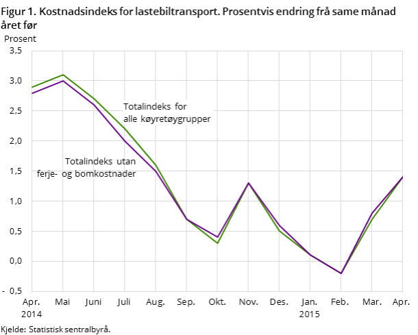 SSB: Totalkostnadsindeksen for lastebiltransport gjekk opp 0,2 prosent frå mars til april 2015. Dei siste tolv månadene auka dei totale kostnadene med 1,4 prosent.