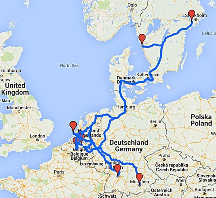Svenskene har den lengste kjøreruten; Scania vil tilbakelegge mer enn 2000 kilometer fra oppstarten i Södertälje utenfor Stockholm til ankomsten i Rotterdam. Kjøreturen begynner 30. mars.