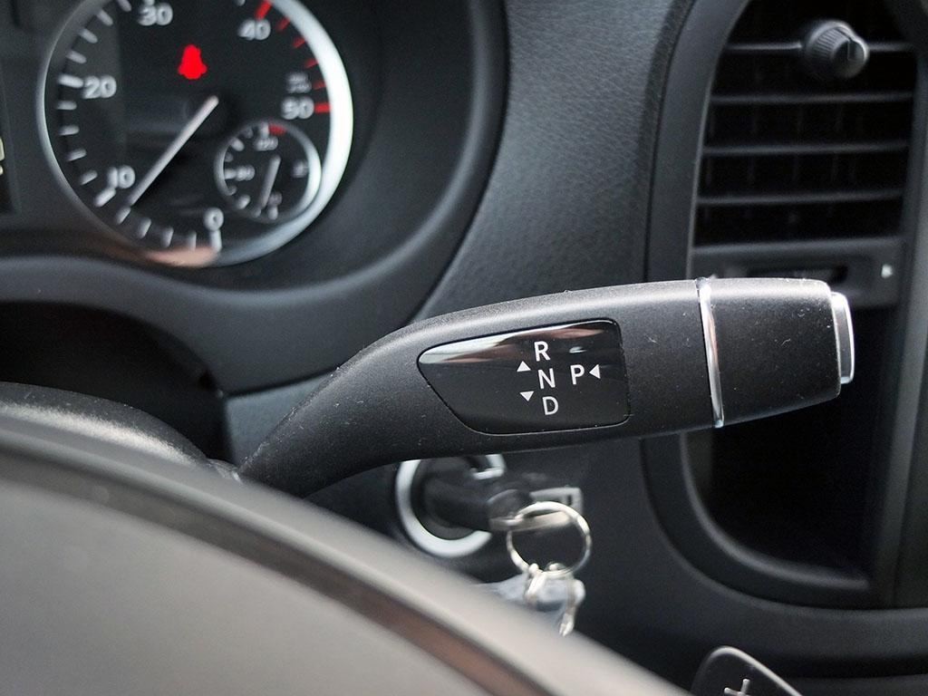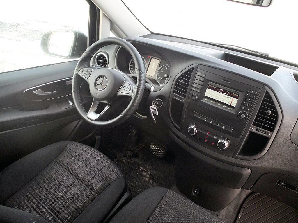 Inne i bilen kan man velge mellom ulike seteløsninger. To enkeltseter kan leveres, eller man kan ha en benk på passasjersiden slik det var i testbilen. Komfortsetet på førerplassen er ekstrautstyr, og har høydejustering, justering av sitteputens vinkel og elektrisk fireveis justering av korsryggstøtten. Samtidig kan rattet justeres i høyde og i lengde. Dermed blir komforten svært god i Vito, og fra personbilene til Mercedes kjenner vi igjen knappene, bryterne og den karakteristiske girvelgeren for automatgiret.