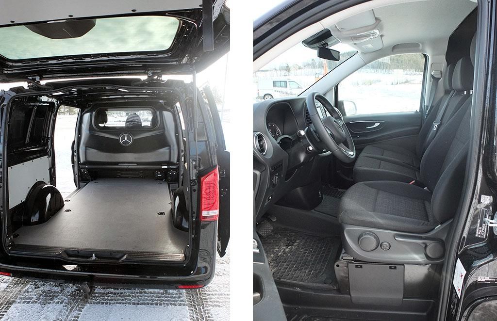 Merceces Vito leveres i tre ulike varianter; kort, lang og ekstra lang. Vi kjørte A2 – eller lang utgave. På den er akselavstanden 3,2 meter og varerommet er 2831 millimeter langt, mens bredden mellom hjulhusene er 1270 millimeter. Mellom skyvedørene på hver side av bilen er det 1686 millimeter bredt. Bakluken på testbilen er topphengslet, mens skyvedøren på venstre side er ekstrautstyr.