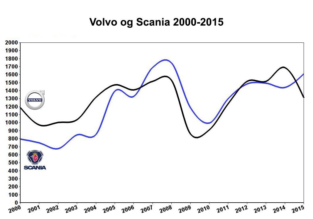 2015 ble et godt år for Scania. De ble forbikjørt av Volvo i 2012 etter mange år i teten og har jaget konkurrenten hardt siden den gang. I fjor kom uttellingen, de byttet ganske bokstavelig plass med Volvo på statistikken over tunge kjøretøy (over 16 tonn): I 2014 ledet Volvo med 41,4 prosents markedsandel over Scanias 35,8, mens i 2015 tronet Scania øverst med 41,9 prosent og vippet Volvo ned til 33,5.