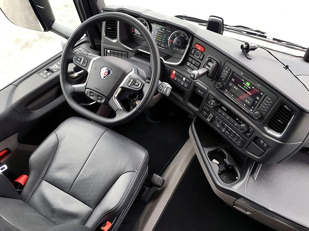 Det store rattet ligger godt i hendene. Instrumentene er oversiktlige og knappene er logisk plassert. I kjent stil omslutter førerplassen føreren, men plasseringen av førersetet er ny. Scania lover bedre fleksibilitet og økt sikkerhet når de har flyttet førersetet nærmere frontruten og ut til venstre.