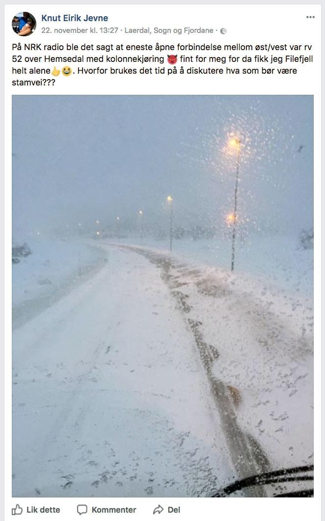- Jeg sto i Lærdal og skulle over fjellet østover. Da jeg skrudde på NRK Trafikk var det kun rv 52 over Hemsedal som ble nevnt som mulig fjellovergang mellom øst og vest. Jeg stusset litt på det og tenkte at E16 over Filefjell umulig kunne være stengt. Først da jeg ringte vegtrafikksentralen på tlf 175 fikk jeg bekreftet at Filefjellet var åpent. Sånn bør det ikke være, sier Jevne. Han kjørte mutters alene over fjellet, uten problemer.