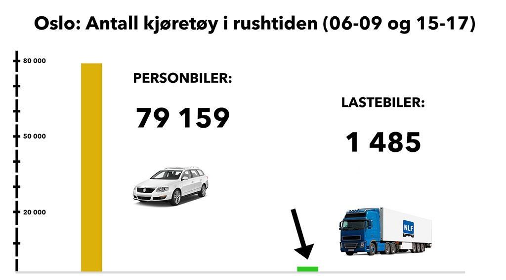 Tall fra NTP-sekretariatet viser at for hver lastebil som kjører i rushtiden i Oslo, kjører det over 50 personbiler. Situasjonen er om lag tilsvarende i Bergen. Dette viser at nyttetransporten allerede har tilpasset seg og har sin rushtid i stor grad utenom personbilenes rushtid.