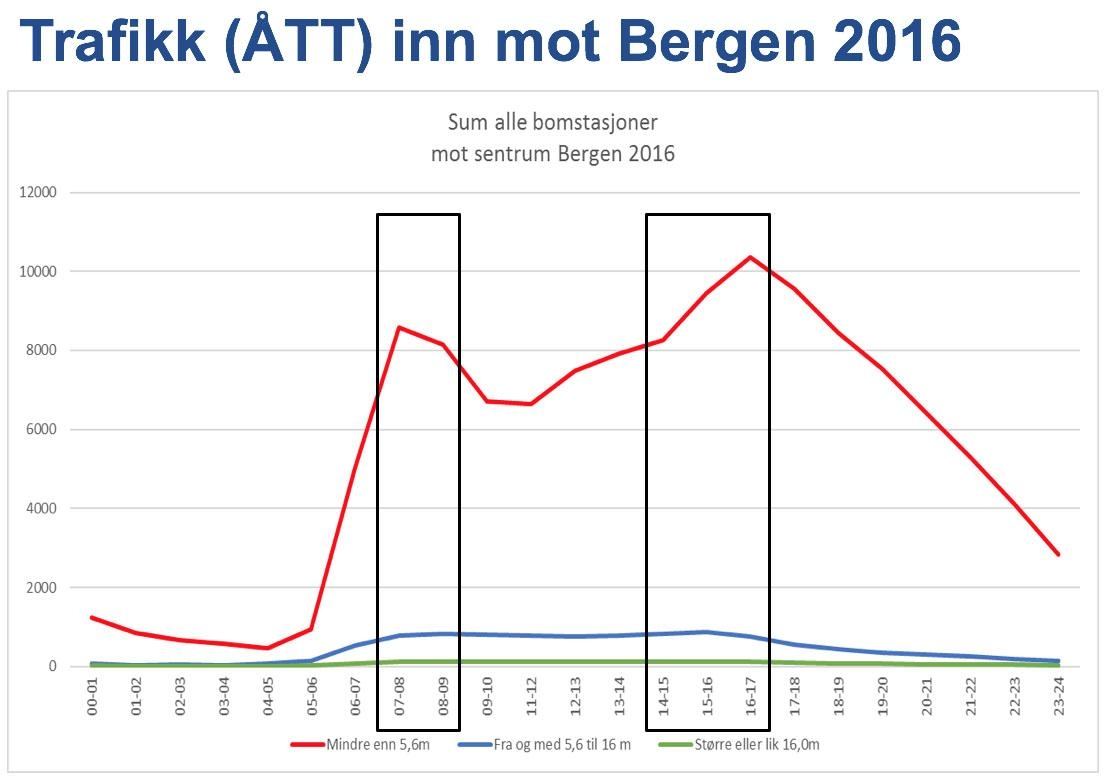 Data innhentet fra bompasseringspunkter i Bergen viser at det i rushtiden har forsvunnet mellom 1 000 og 1 200 personbiler i timen etter at rushtidsavgiften ble innført. Men for større kjøretøy har reduksjonen vært minimal. For lastebiler over 16 meter ble det kun registrert ett kjøretøy mindre per passeringspunkt per time i 2016 enn det ble i 2015.