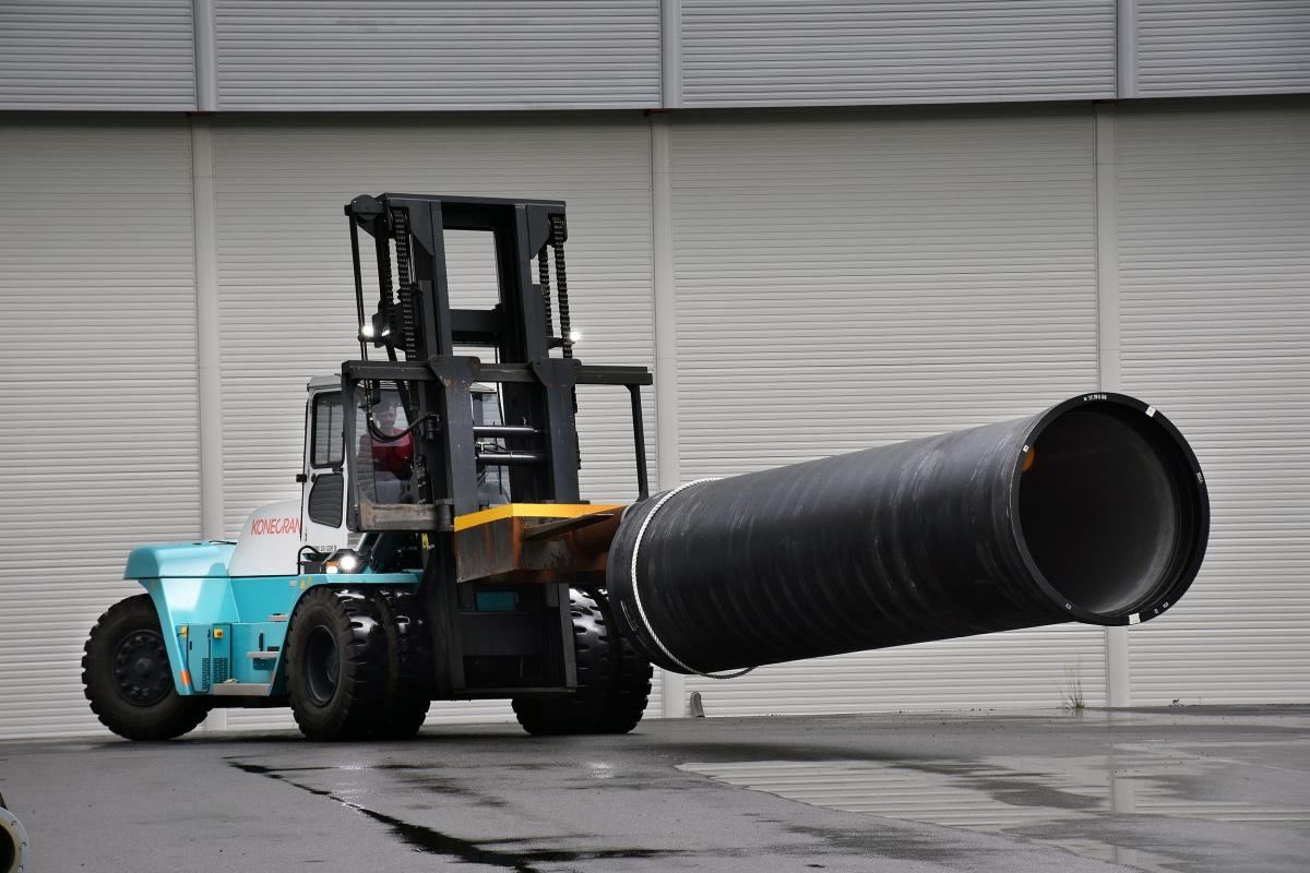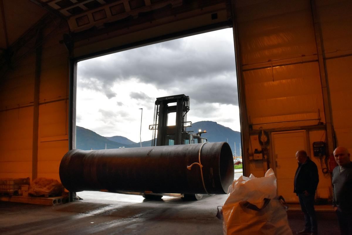 Rundt et hjørne blir vi møtt av en mastodont av en gaffeltruck. Bak rattet sitter terminalsjef Stein Meyer som drevent navigerer de betongbelagte kjemperørene, først fra lossestedet ute på den åpne plassen, deretter inn i en lagerhall med bare noen centimeters klaring gjennom porten. Rørene er særdeles verdifulle og må håndteres av fagfolk - enda en tjeneste som Einar Valde AS tilbyr.
