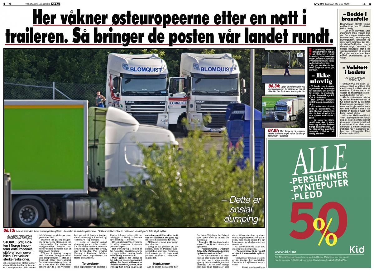 – Dette er statlig sosial dumping på sitt aller verste. De bor i bilen i ukevis mens de er i Norge og jobber for Bring, fortalte kretsleder Tor Øyvind Fevang i Postkom til VG, som den gangen hadde fotografert bilene parkert utenfor Brings anlegg på Borgeskogen i Vestfold.