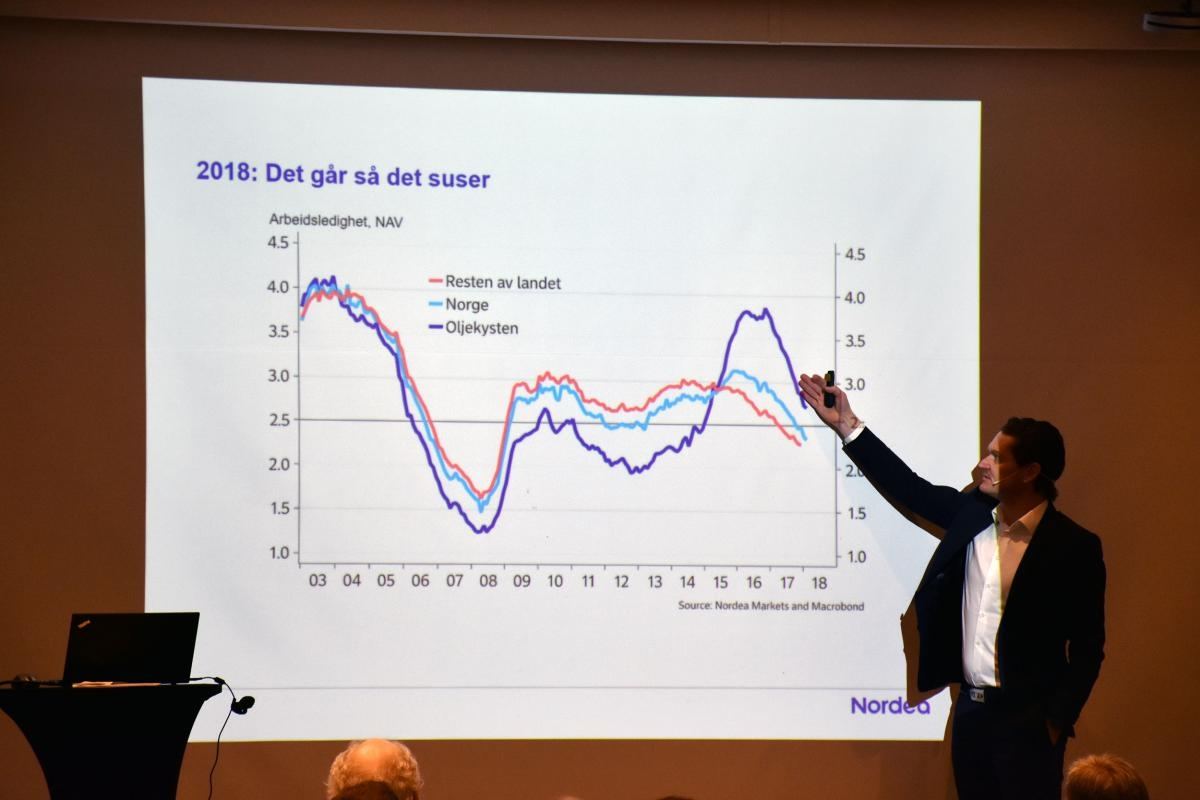 - Det er ingen grunn til å være bekymret for fremtiden ut ifra de modellene vi baserer oss på. Oljebransjen har fått en uventet oppsving, estimatene for hvor høy oljepris en må ha for at et oljefelt skal kunne være lønnsomt er kraftig nedjustert. Samtidig går ledighetstallene fra NAV skarpt nedover, og boligprisene har stabilisert seg på et bærekraftig nivå, forteller sjefsøkonom i Nordea, Kjetil Olsen.