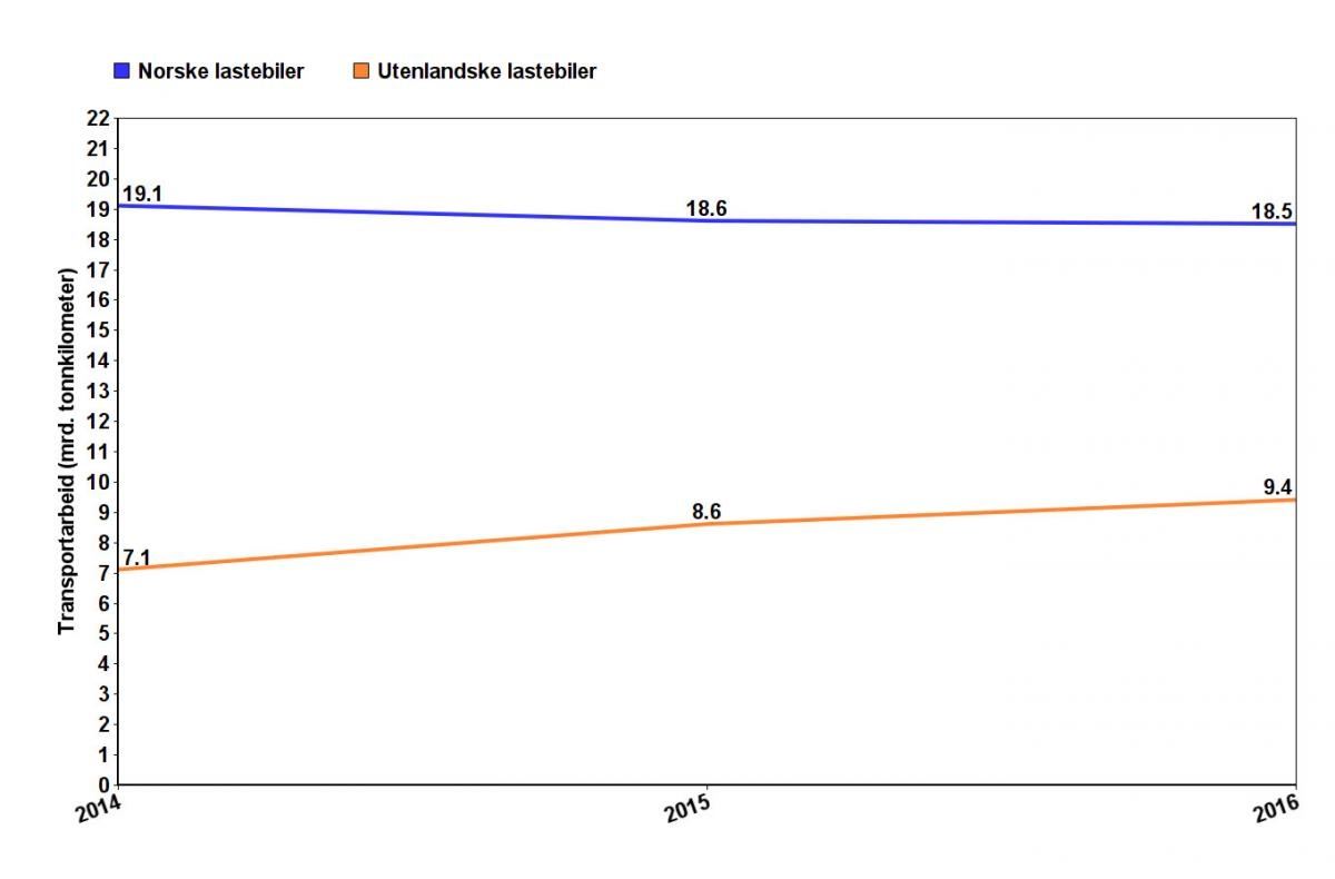 Samtidig opplevde norske godsbiler en nedgang i transportarbeidet på rundt 3 prosent, fra 19,1 mrd. tonnkilometer i 2014 til 18,5 mrd. tonnkilometer i 2016.