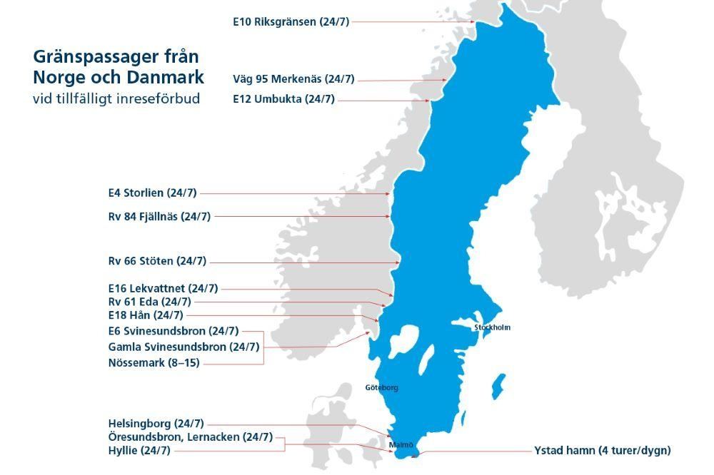 Er du unntatt innreiseforbudet henvises du til de anviste grensepassasjer for å reise inn i Sverige. Kartet under viser alle åpne grensepassasjer. Åpningstider står bak. De største grensestasjonene er døgnåpne (markert med 24/7 i kartet).