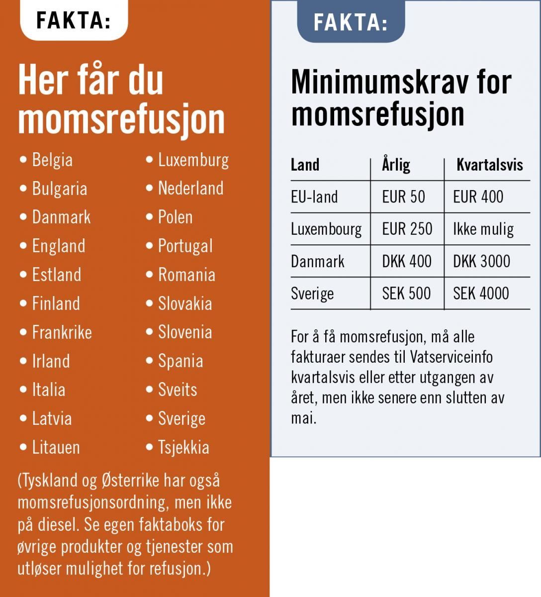 Nettofakturering tilbys i Sverige, Danmark, Frankrike, Luxembourg, Nederland. Merk at Tyskland og Østerrike ikke er på denne listen, siden disse landene ikke tilbyr momsrefusjon på diesel. (Se egen faktaboks for oversikt over land som er dekket for momsrefusjon.)