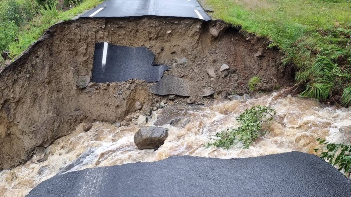 - På Austsidevegen i Begnadalen har vannmassene gått rett over fylkesveg 2458 Nordre Grimsrud, og delt hele vegen i to.
