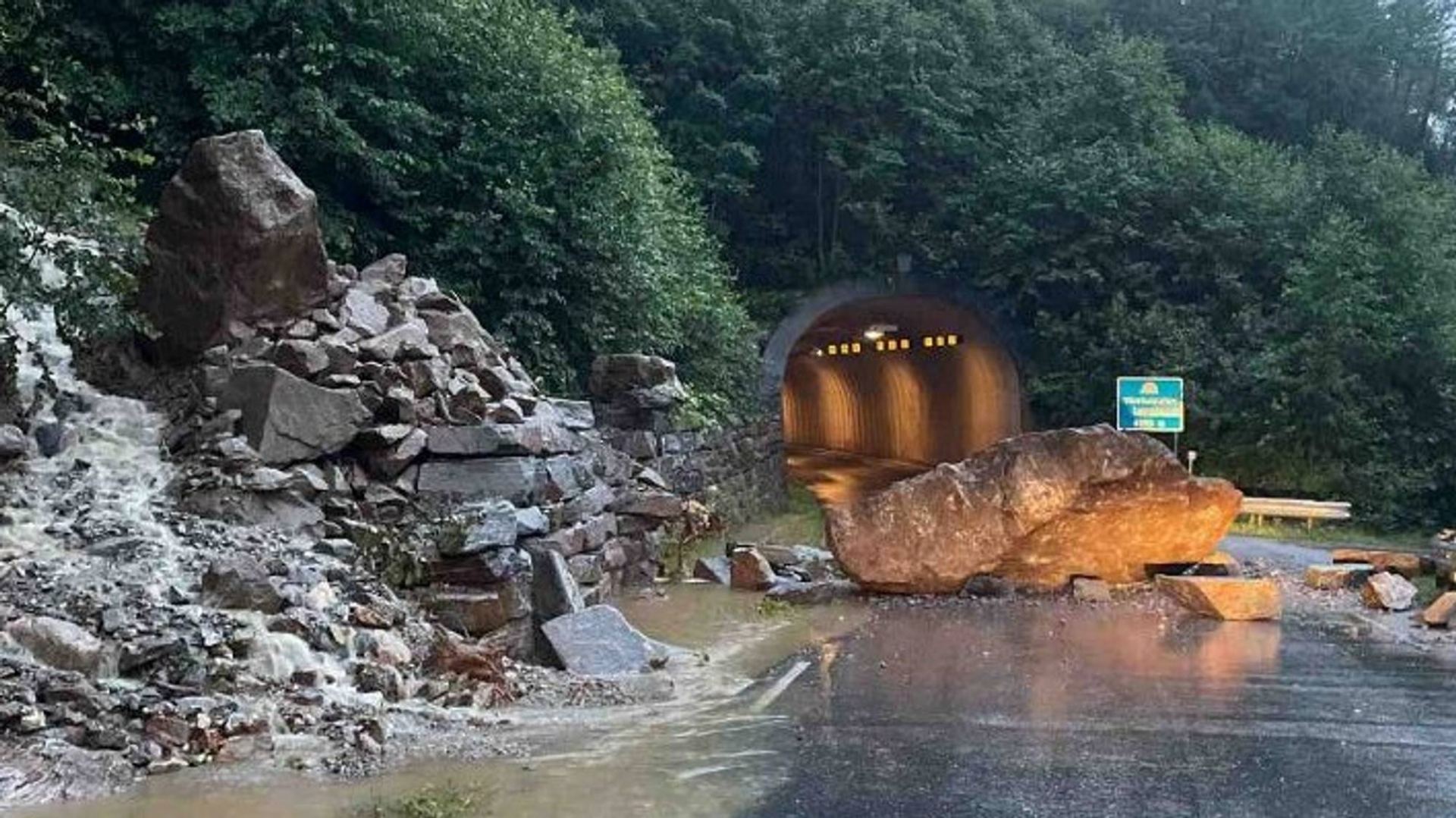 Det meldes også om at en stor stein har rast ned på vegbanen i Eikesdalen ved inngangen til Viketunnelen på fylkesveg 191 i Molde kommune.