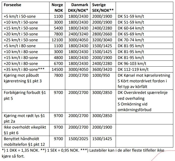NLF-direktøren mener også at det i en vurdering av størrelsen på bøtesatsene, ville vært relevant å sammenligne seg med andre land. Tabellen nederst i saken viser bøtenivåene i Norge, Danmark og Sverige for sammenlignbare brudd på trafikkregler, med bøtesatsene som nå er innført i Norge.