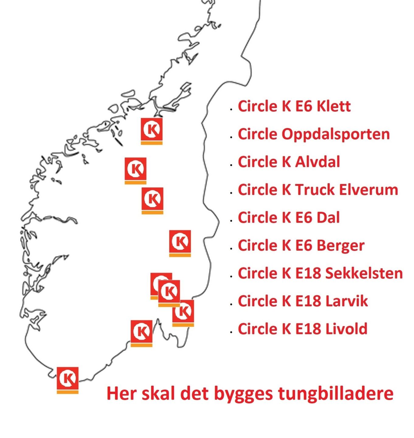 Det vil komme tungbil-ladere på E6 Klett, Oppdalsporten, Alvdal, Elverum, Dal, Berger Sekkelsten, Larvik og Livold.
