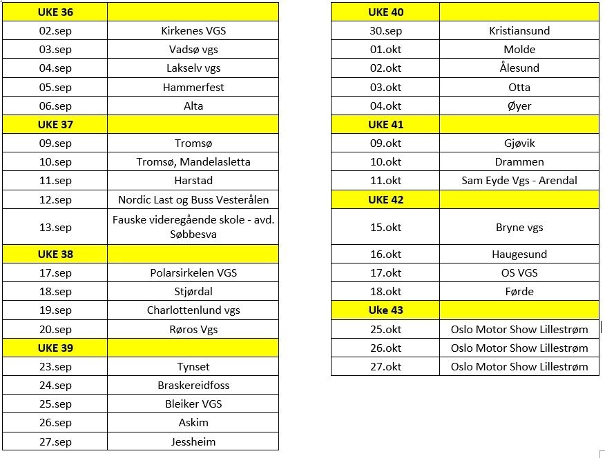 I løpet av seks hektiske uker skal «Følg drømmen - ikke strømmen»-turnéen besøke rundt 30 skoler fra nord til sør i landet. Det er forventet at mellom 7000-8000 ungdommer vil få mulighet til å treffe transportnæringen og få mer kunnskap om alt den har å by på.