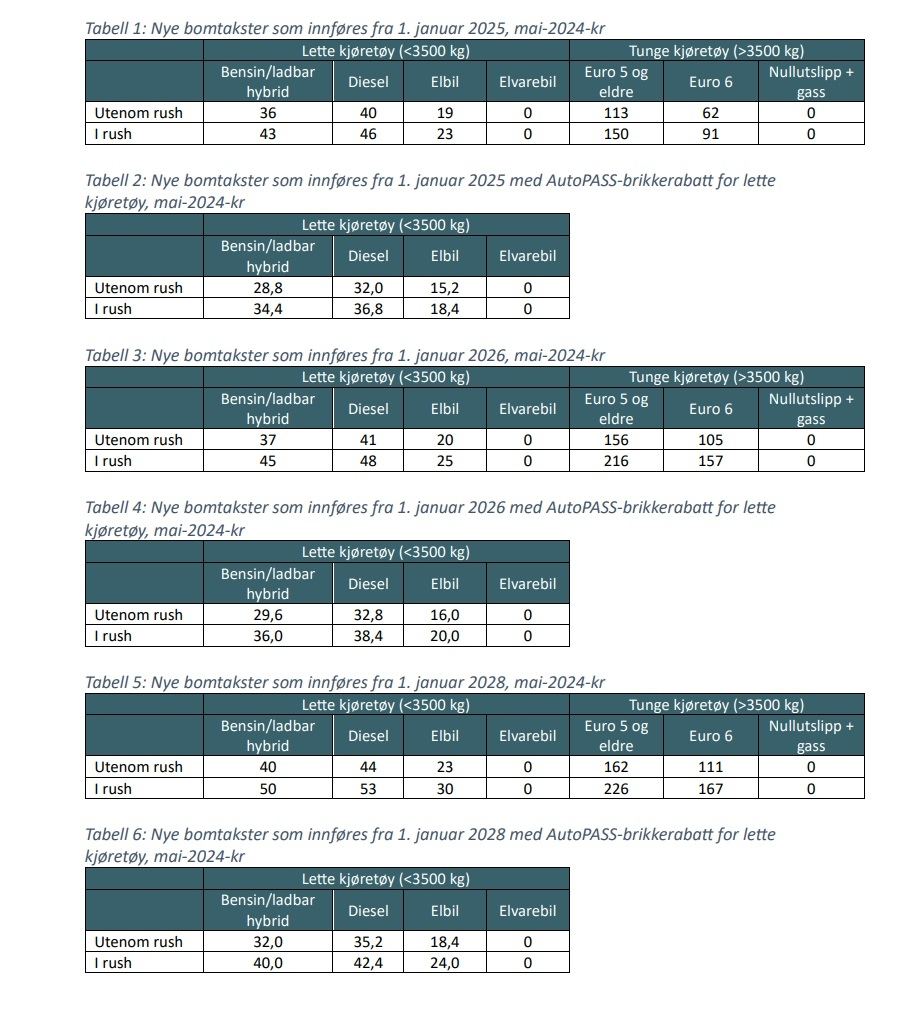 Tabellen viser nye takster som innføres 1. januar 2025, 1. januar 2026 og 1. januar 2028. De nye bompengetakstene skal prisjusteres til aktuell kroneverdi før de innføres, med utgangspunkt i konsumprisindeks fra mai 2024.