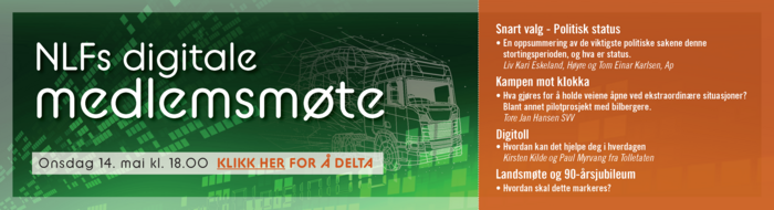 I onsdagens digitale medlemsmøte var det kommende valget hovedtema, med politiske diskusjoner som påvirker transportnæringen. Vi tok også for oss Kampen mot klokka, et viktig beredskapsprosjekt, samt de nye endringene med digitoll og NLFs kommende 90-årsjubileum.