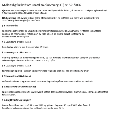 Unntakene gjelder for sjåfører som er direkte berørt av stengingen av tunnelen, og som utfører nasjonal eller internasjonal veitransport av gods.