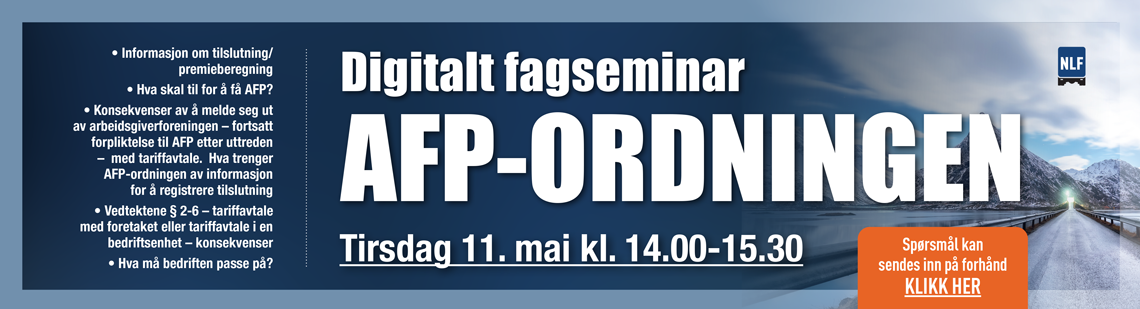 Vi har gleden av å invitere deg til et fagseminar om avtalefestet pensjon (AFP) 11. mai kl. 14:00-15:30. Har du spørsmål om AFP, må du gjerne sende dem inn i forkant til aev@lastebil.no