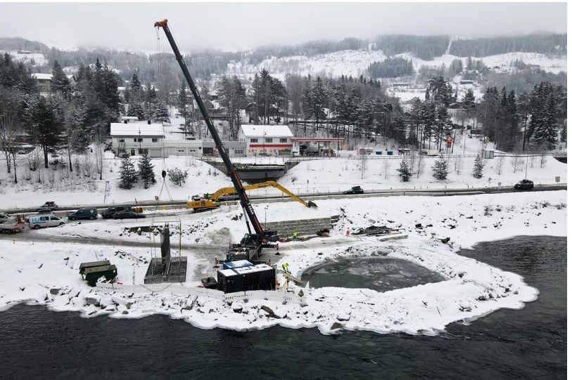 Brua bygges av Statens vegvesen. På E6-siden jobber entreprenøren med å støpe et nytt fundament ute i elva, og noe av dette arbeidet foregår under vann.
