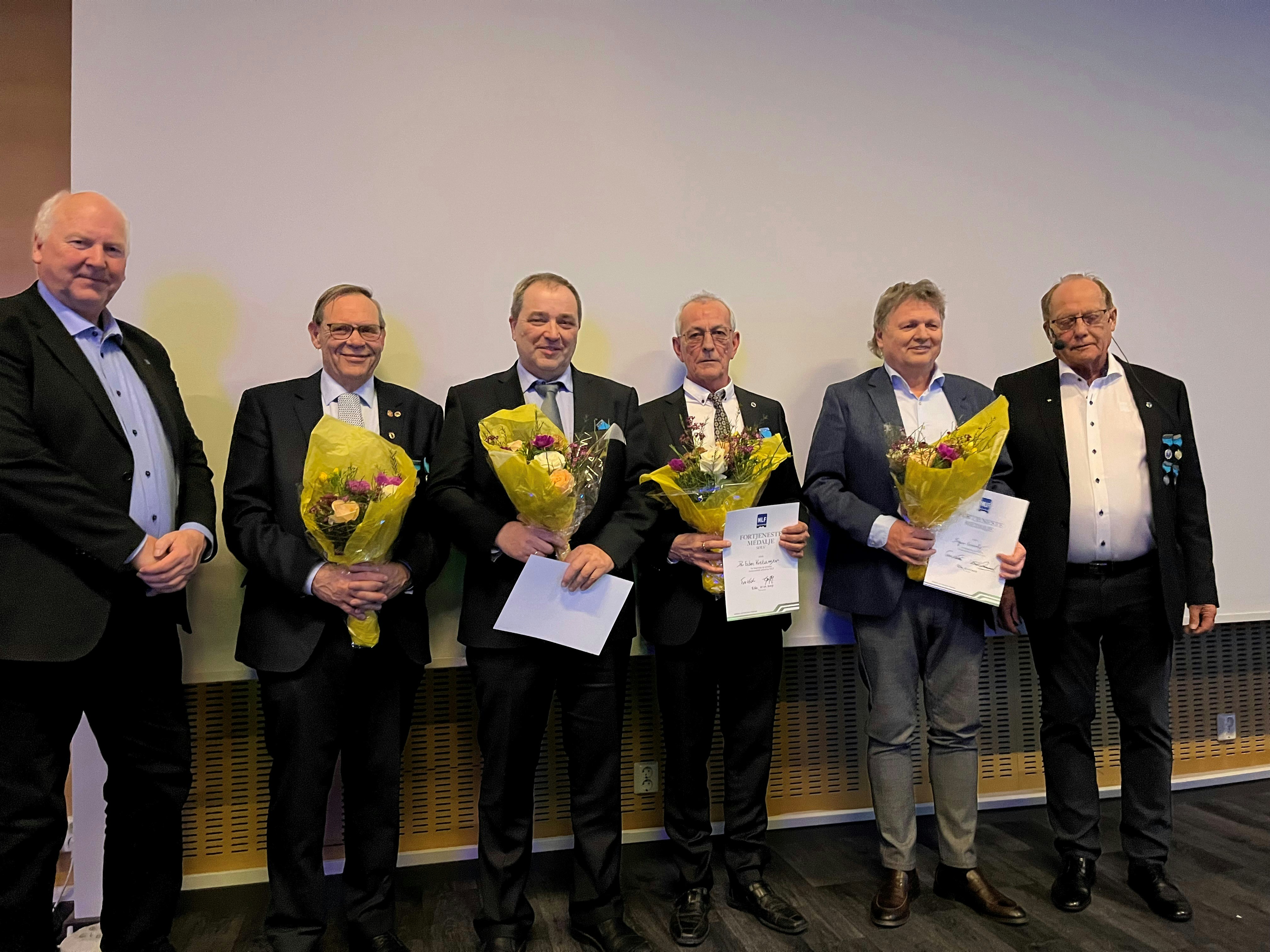NLF Østfold hedret flere sentrale tillitsvalgte under sitt fylkesårsmøte i Strømstad. Forbundsleder Tore Velten og fylkesleder Erik Graarud inviterte fire stolte medlemmer opp på scenen, slik at de kunne motta NLFs fortjenestemedalje i sølv. De fire var Steinar Enderød, mangeårig leder og nestleder i Moss, fylkesstyremedlem og kollegahjelper, Anders Krog, forbundsstyremedlem fra region 1, tidligere fylkesstyremedlem og leder i Sarpsborg. Per Esben Kristiansen, leder i Moss Vognmannsforening og fylkesnestleder i Østfold og Ingar Granly, mangeårig leder av Fredrikstad og fylkesstyremedlem. Vi gratulerer!!